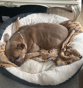Kuscheln ist ihr Lebenselixier, am liebsten unter der Bettdecke, außerdem kennt Nicoleta die Hundebox, den sie gerne als Rückzugsort nutzt.