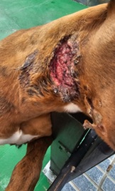 Unsere Partner brachten Benito sofort zum Tierarzt. Dort wurde die Wunde in Narkose gründlich gereinigt, versorgt und stabilisiert. Aufgrund des schweren Defekts konnte nicht genäht werden; stattdessen erhielt Benito eine schonende Versorgung. Die medizinische Behandlung war umfangreich und Benito hat sich dabei tapfer geschlagen.