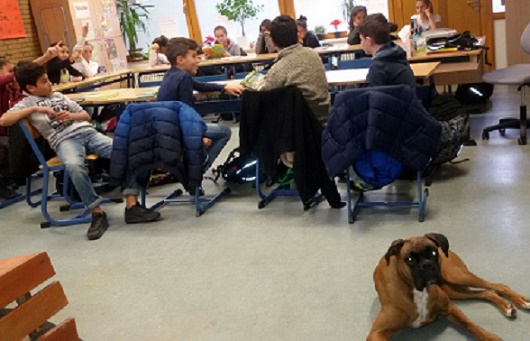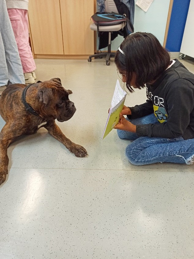 Selbstverständlich waren die Kids extrem nervös- wie gut dass da eine Boxerhündin unauffällig aufs Lesesofa in der Schulbibliothek stieg und sich entspannt zwischen die Kinder aus Förderschule und Regelklasse legte, das sorgte für Lächeln und Ermutigung.
