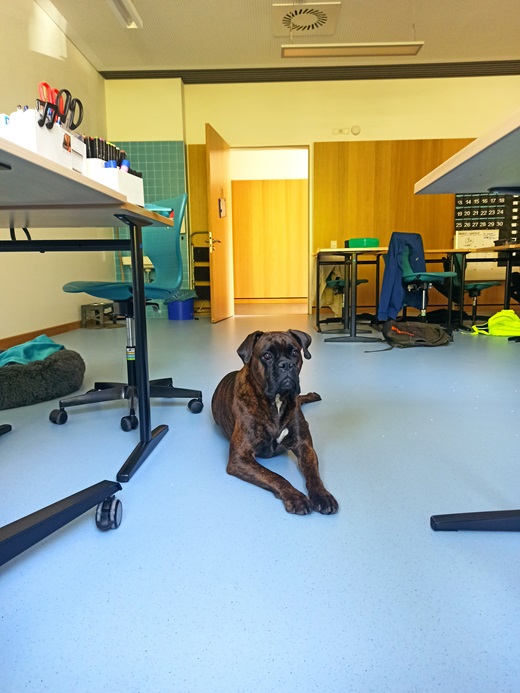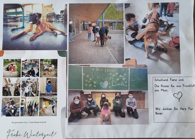 Die Klassenlehrerin der 7a, Frau Ram, und ihre Klasse unternahmen vergangene Woche einen Selbstversuch und luden die Boxerhündin „Inka“, anderthalb Jahre alt, der Klassenlehrerin Frau Ram, zum Klassenrat im Nachmittagsunterricht ein. Dabei wurden im Vorfeld feste Regeln im Umgang mit dem Hund getroffen und die Schüler*innen bereiteten sich inhaltlich im Ethikunterricht auf das Verständnis der Körpersprache zwischen Hund und Mensch vor. „So leise waren wir noch nie!“, stellte Paula, Klassensprecherin der 7a, die den Klassenrat leitete, erstaunt fest. „Inka soll uns noch einmal besuchen kommen, dann kann ich mich besser konzentrieren!“, bestätigte Wesely, Schüler der 7a, die positive Wirkung des Hundebesuchs. Ein kurzes einmaliges, aber auch gelungenes Projekt, danke an die Klasse 7a und die Schulleitung für die Unterstützung.