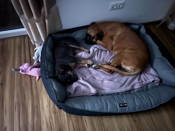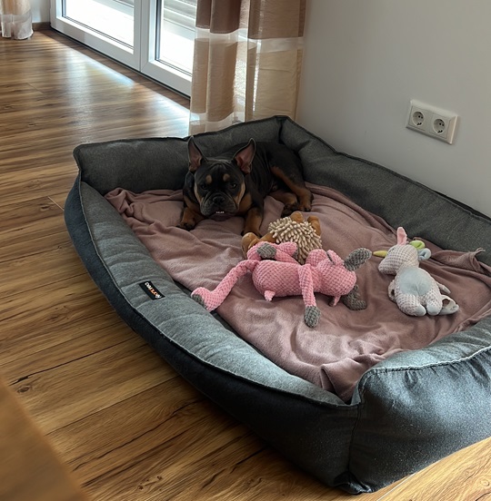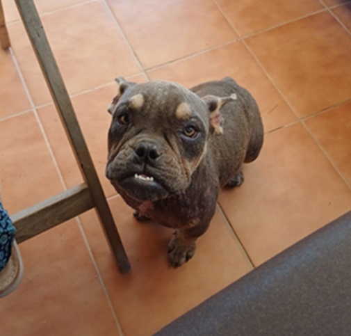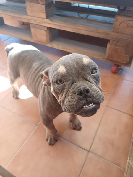 Ich wohne nun bei einer netten Boxerhündin (auch hier vom Verein). Frauchen sagt, dass wir vom Wesen und der Agilität sehr ähnlich seien. Also ich bin kein überdrehter Bulli, sondern eher vorsichtig, ruhig und einfach nur lieb.