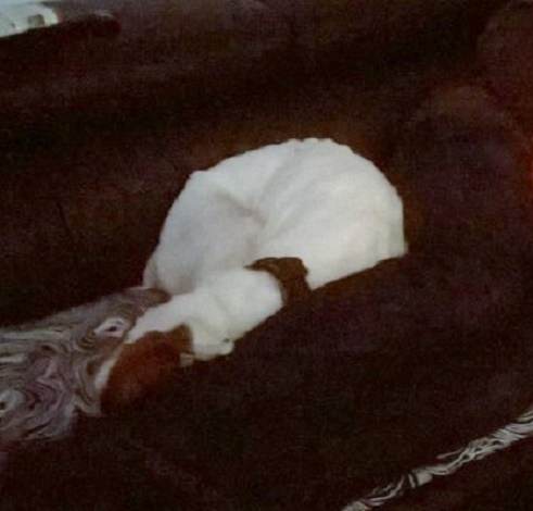 Mein Futterneid ist leider noch da, aber bereits moderat. Ich liege brav auf meinem Platz, wenn meine Leute hier auf der Pflegestelle essen. Nur wenn ihr was Essbares liegen lasst oder der Mülleimer steht auf, dann bin ich zur Stelle.