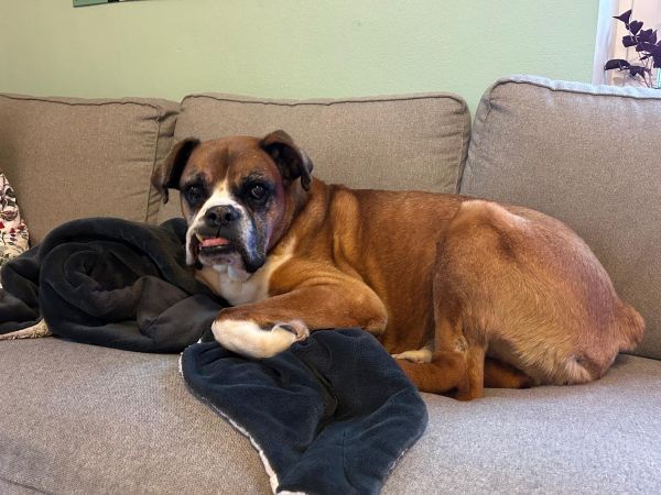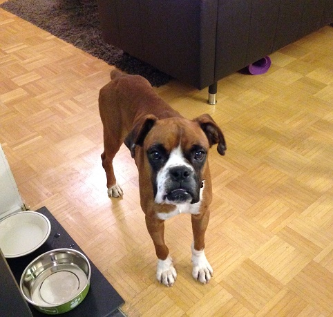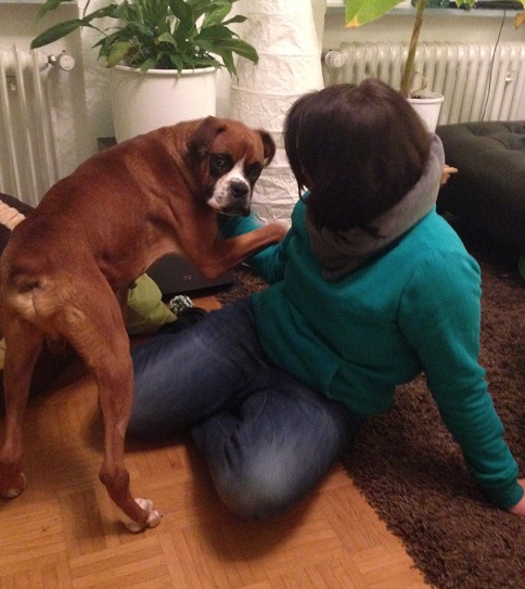 Nach zwei Tagen in denen er vor allem geschlafen hat, hat er sich schon näher an uns rangetraut und hat das Schmusen und Kuscheln für sich entdeckt. Er macht dem Namen Boxer alle Ehre, am liebsten boxt er beim Spielen mit den Vorderpfoten, wenn er seinen Teddybär zurückerobern will.