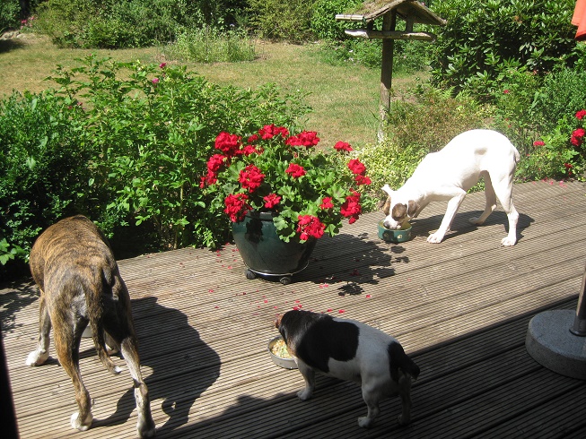 Klaudia ist die Rudelführerin. Ich lerne, dass man ihr nicht auf der Nase herumtanzen darf, dass sie aber ganz viel schöne Dinge mit uns macht. Jeweils morgens und abends eine Stunde spazierengehen, im großen Garten toben, Bälle aus dem Teich holen, nur meinen Fressnapf leer zu fresssen, Nachbarn kennenlernen, Nachbarhunde zum Spielen einzuladen oder zu besuchen.
