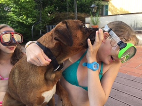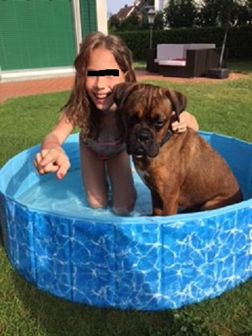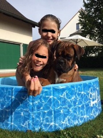 Da Hutch nicht in den grossen Pool darf, habe ich ihm einen „eigenen Pool“ gekauft, damit auch er sich bei dieser „Bullenhitze“ abkühlen kann. Er liebt es und die Mädels sitzen dann zwischendurch mit Hutch schon mal im „Hundepool“ anstatt im grossen zu schwimmen!