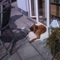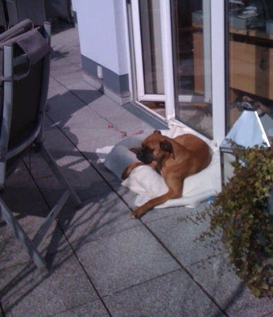 Er ist so ein lieber. verschmuster Kerl – seine Lieblingsbeschäftigungen sind jetzt fressen, schmusen. Mit Hundekumpels spielen, mit Herrchen laufen, und Ball spielen!! Autofahrten findet er ganz fürchterlich. Cabriolet offen geht mit ihm gar nicht, er hat vielleicht schlechte Erinnerungen aus Spanien……, also fährt er vorwiegend mit meinem Mann oder ich lasse das Dach geschlossen! So oft ist es in Deutschland ja auch nicht schön!!!!!!!