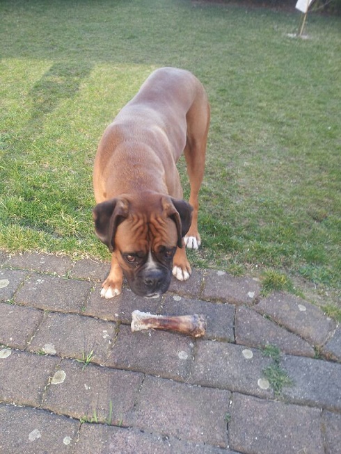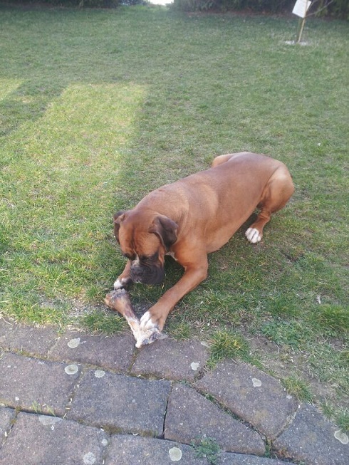 Die Sonne scheint, die Vögel zwitscher und ich genieße im Garten meinen Kalbsknochen!