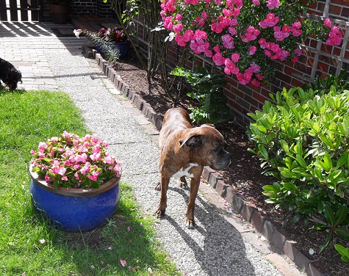 Wenn sie wieder mal vor Temperament überschäumt, dann rennt sie in einem wahnsinnigen Tempo im Garten und spielt mit Kolja Nachlaufen um alle Büsche.