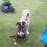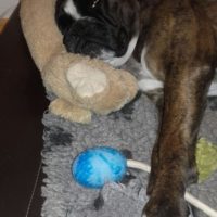 So langsam wird sie ein fröhlicher Boxer, der sich beim Spazierengehen auch mal ein paar Meter nach vorne wagt. Sie hat auch keine Probleme mit kleinen kläffenden Hunden, sie bleibt total gelassen.
