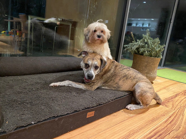 Bei der Arbeit genieße ich meinen Büroschlaf und das Spielen mit meinem Hundrudel.