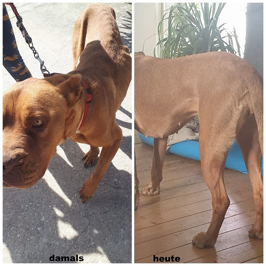 ich bin jetzt schon über ein halbes Jahr in meiner neuen Familie. Vom meinen anfänglichen dürren 32 Kilo bin ich jetzt auf 37 Kilo gefüttert worden, wie man an dem Bild sieht, bekommt mir das auch ganz gut. Ich zeige mich sehr gehorsam (wenn Frauchen Futter einstecken hat) und liebe Suchspiele, aber auch mit meinem kleinen Hundekumpel los zu düsen oder zu raufen finde ich klasse.