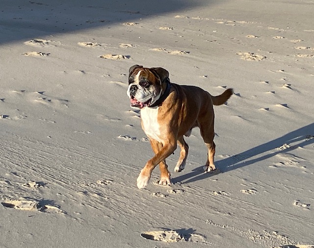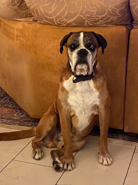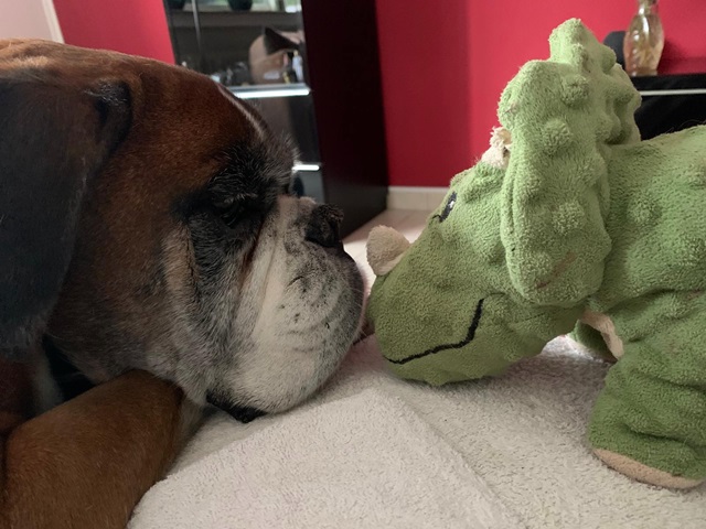 Die anderen Hunde, die wir über Boxer in Not aufgenommen haben, wurden leider alle nicht sehr alt, waren sie doch zumeist schon krank wenn wir sie bekamen. Auch Fergus hat seine kleine Freundin Dora nach kurzer Zeit verloren. Sie war ein 10jähriges Scheidungskind, verwahrlost und abgeschoben und durch Zufall, ohne den Verein, bei uns gelandet, aus einer „Familie“ am Niederrhein. Leider saß sie schon voller Krebs, der nie erkannt oder behandelt wurde, weil sich niemand um sie gekümmert hat („ Ist halt ein schlanker Boxer, ist doch gut“….) Aber Fergus und sie hatten noch fünf Monate zusammen, in denen sie wie ein altes Ehepaar waren. Für Fergus war es sicherlich ein gute Erfahrung, mit einem Rudelmitglied, das mehr als zwei Beine hat. Als Dora uns verlassen musste, hat er wochenlang getrauert, dennoch möchten wir alle die Zeit sicher nicht missen.