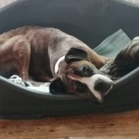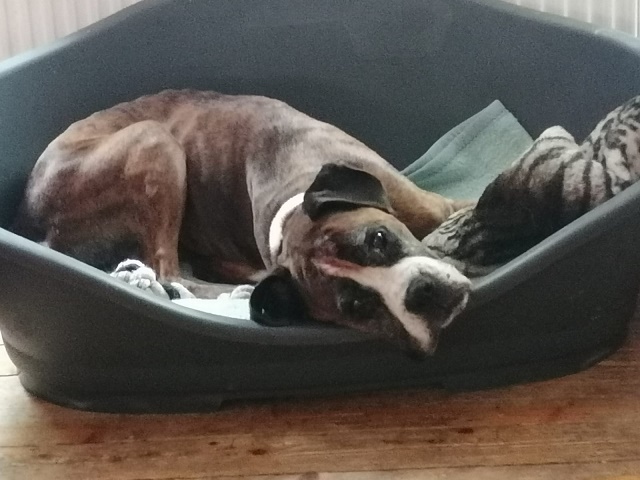 Ich komme mit meinem Hausgenossen gut aus, spiele und tobe noch gerne, aber kuscheln mit meinen Frauchen gehört definitiv zu meiner Lieblingsbeschäftigung.