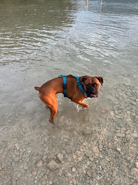 Nach dem Urlaub, hieß es erholen und auf Mamas Liege im Garten zu relaxen. Sein Lieblings Spielzeug ist der Chuck it Ball und der Kong Bounzer in xl.