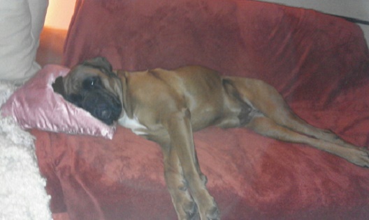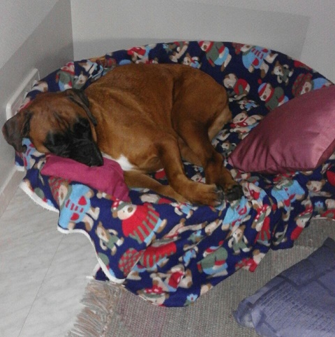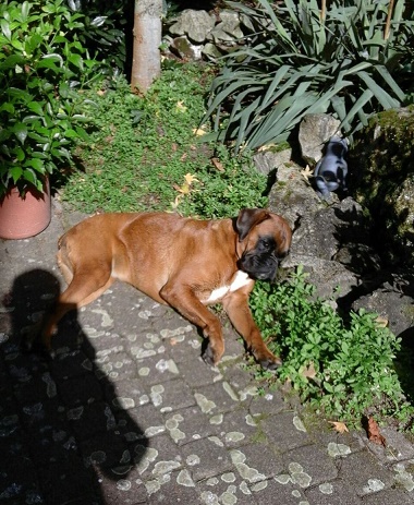Hier bei meinem neuen Frauchen fühle ich mich super wohl, habe meinen eigenen Garten, mein Bett und natürlich „boxerlike“ die Couch erobert.