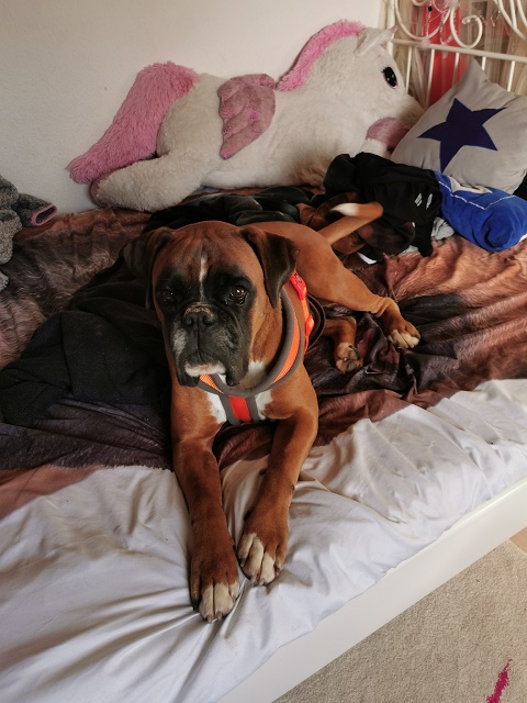 Ich liebe echt alle Menschen und möchte so gerne so richtig mit Euch kuscheln, fest in Euren Armen liegen – so ganz nach Boxermarnier!