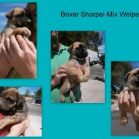Bei den drei Jungs handelt es sich um Boxer-Sharpei-Mixe.