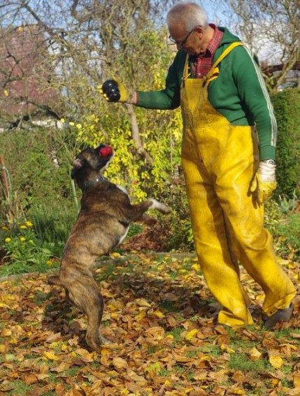 Dank Ihrer liebevollen Hilfe, hab ich jetzt mein Zuhause gefunden. Mir geht es hier richtig gut. Herrchen spielt jeden Vormittag mit mir auf unserem Rasen. Er wirft verschiedene Spielzeuge und ich flitze hinter her, oder fange sie gleich aus der Luft auf. Das kann ich stundenlang. Er übt dabei auch Gehorsam mit mir. Ich finde, das klappt schon sehr gut, aber er meint, wir müssten doch noch viel üben.
