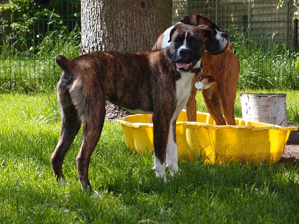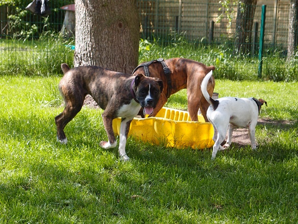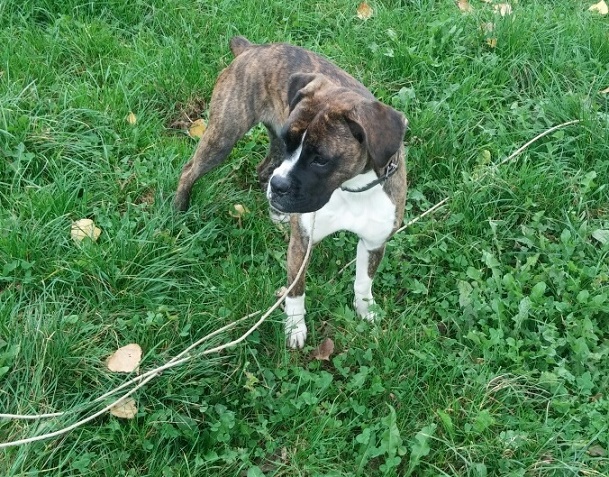 Einen Freund hab ich auch schon, er heißt Anton. Wir dürfen zusammen über die Felder toben, führen manche Kämpfe miteinander aus – aber immer mit viel Spass. Er hat mir auch schon den Wassergraben gezeigt, finden wir zwei ganz toll – unsere Frauchen nicht so sehr, weil nur ganz schmutziges Wasser drin ist.