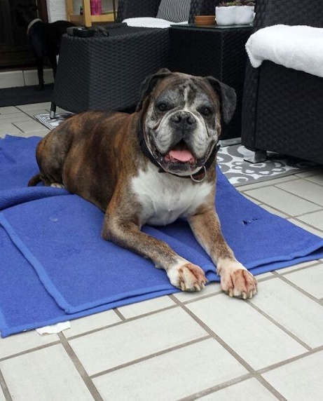 Ich verstehe mich mit allen anderen Hunden denen wir begegnen und spiele sogar manchmal kurz, zumindest so lange, wie es meine alten Knochen noch zulassen. Ich habe ein bisschen Probleme beim Laufen, aber mit ein paar Schmerzmittelchen geht es mir gleich viel besser.