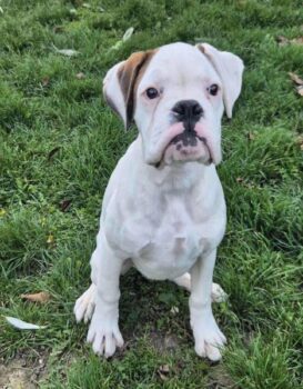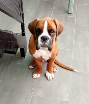 Boni ist ein typisch quirliger junger Boxer, aufgeweckt, verspielt und munter.