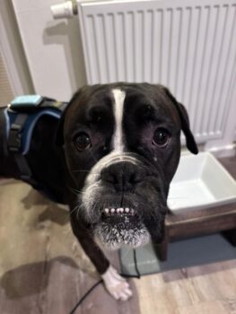 Die Knallerei zu Silvester konnte ich nur im Keller ertragen, aber dafür bin ich Neujahr mit Schnee entschädigt worden. Seitdem habe ich drei Lieblingsplätze: Küche, Sofa und Garten. Gegen die Kälte hilft Ballspielen und im Schnee buddeln – danach muss man sich natürlich in der Küche stärken …