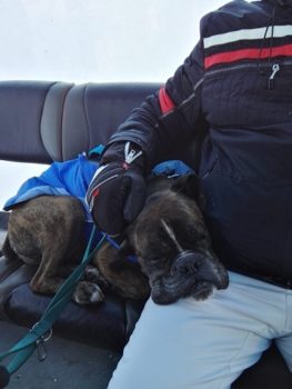 Auf der Autofahrt hat er binnen einer Stunde einen Kauknochen begeistert benagt und gefressen.