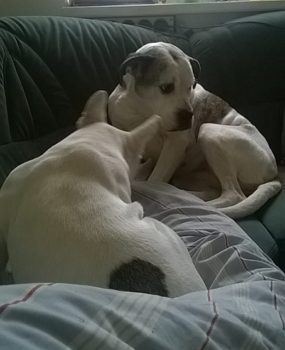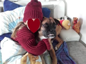 Aber manchmal kommt doch noch seine Angst durch, vor allem fremdem Kindern und Männern gegenüber. Aber er will dann nicht mehr abhauen oder will beißen, sondern rückt einfach näher an uns …