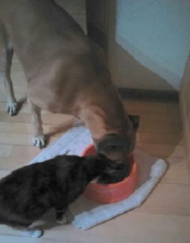 Nach anfänglichen Startproblemen hat er sich super eingelebt. Die Katzen mögen ihn noch immer nicht, Pferde mag er nicht, aber Hühner hat er zum Fressen gern.