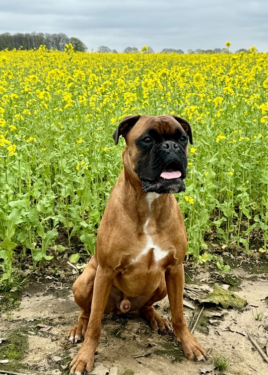 Ich bin mit Hündinnen und Jungspunden verträglich, gehe super gerne Gassi und bin voller Energie! Ein echter Jungboxer eben, mit faustdick hinter den Ohren, aber ich bin sehr charmant dabei.