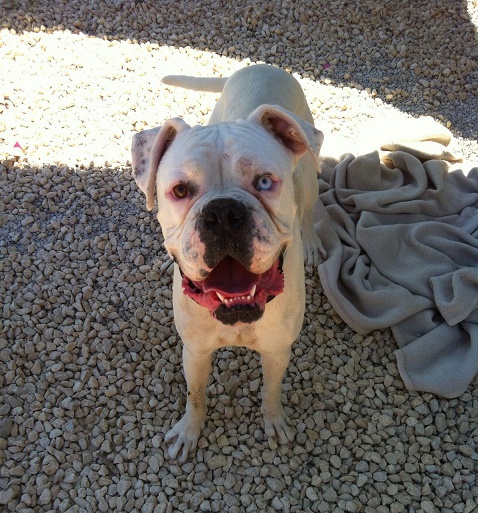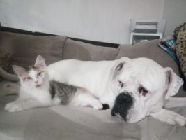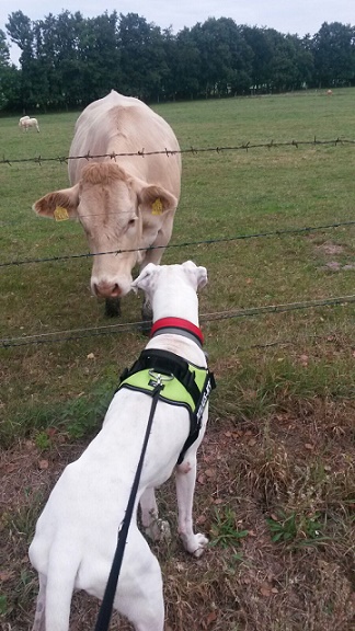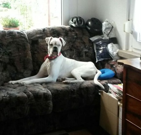 Copi ist auf jeden Fall mit Hündinnen verträglich. Ein typischer verspielter Boxer, der genau weiß, wie man die Menschen um die Pfoten wickelt. Seine unterschiedlich farbigen Augen machen ihn ganz besonders und taub ist er nicht!