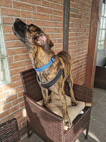 Mein Frauchen sagt ich bin so ein sanftmütiger Riese und lerne sehr schnell. Mit kleinen Kindern geh ich ganz besonders sanft und zärtlich um, obwohl ich auch manchmal etwas ungestüm bin, aber nur, wenn kein Kind in der Nähe ist.