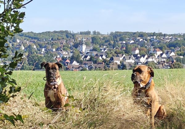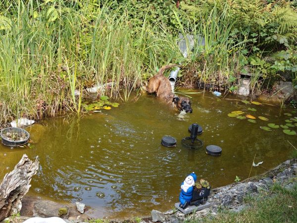 Die Gegend hier ist toll, es gibt grüne Wiesen und viele Wälder, in denen wir alle gerne zusammen spazieren gehen. Wir haben auch einen Garten mit einen kleinen Teich. Bei meiner Begutachtung am ersten Tag bin ich da direkt mal reingefallen. Wer hätte auch gedacht, dass Duna die Große nicht übers Wasser gehen kann. Aber zum Glück bin ich nicht Wasserscheu, auch der Sauerländer Regen auf so manchem Spaziergang macht mir nichts aus.