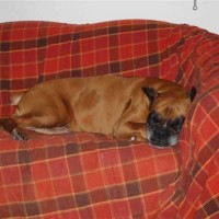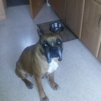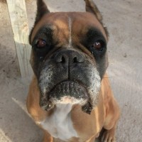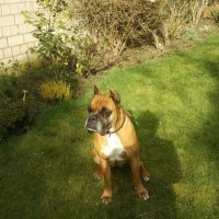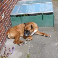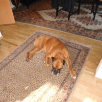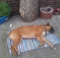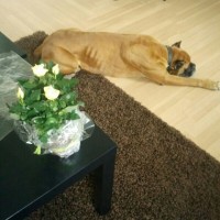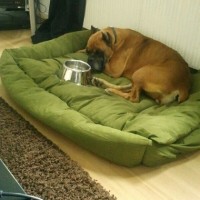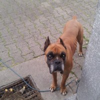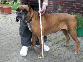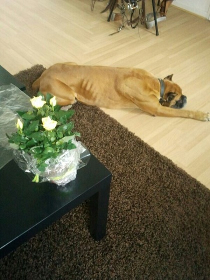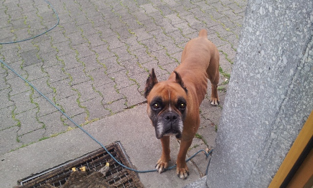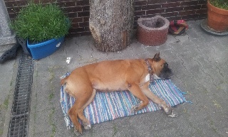 Ich hatte ja schon eine Endstelle, aber da habe ich mich überhaupt nicht wohlgefühlt. Einen Tag habe ich es da ausgehalten, dann habe ich hier angerufen und gebettelt, dass ich wieder fort darf! Die lieben Menschen von Ein-Herz-für-Boxer haben mein Flehen sofort erhört und mich abgeholt. Nun bin ich auf einer neuen Pflegestelle und muss sagen: 10-Sterne-Hotel! Hach, was fühle ich mich hier wohl! Es gibt Futter vom Feinsten, Frauchen sagt dazu „Barf“. Das wäre gut für meine Verdauung und auch die Winde! Ich weiß nicht, was sie damit meint, aber sie sagt, ich stinke nun nicht mehr so und rieche auch weniger aus dem Maul. Na gut, wenn die das sagt!