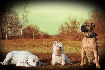 Ich lebe hier mit einer alten Westi Dame und einem Bulldog-Boxer Mix Rüden zusammen, mit denen ich mich ausgezeichnet verstehe, auch wenn es beim Raufen schon mal ganz schön zur Sache geht, natürlich nicht mit der älteren Dame- da bin ich eher Gentleman.