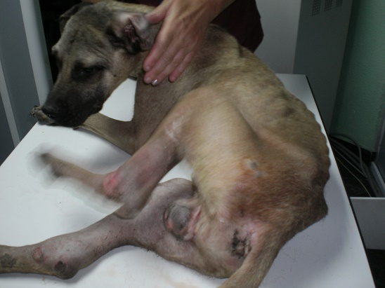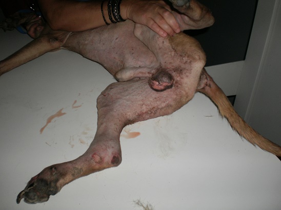 Das Versagen der Beine und Pfoten ist nicht auf Brüche oder Arthrose zurück zuführen, wie wir eigentlich vermutet hatten. Flaco ist quasi übersät von Bissverletzungen. Hauptsächlich sind die Beine und die Genitalien davon betroffen. Die Wunden sind teilweise sehr tief, einige sind offen und eitern. Er hat eine schwere bakterielle Infektion.