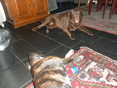 Wie ihr sehen könnt habe ich einen großen Beschützer, der uns manchmal besucht. Das ist Rocky, der stolze Labrador und er hat mir das Ballspielen beigebracht – vorher wusste ich nichts damit anzufangen.