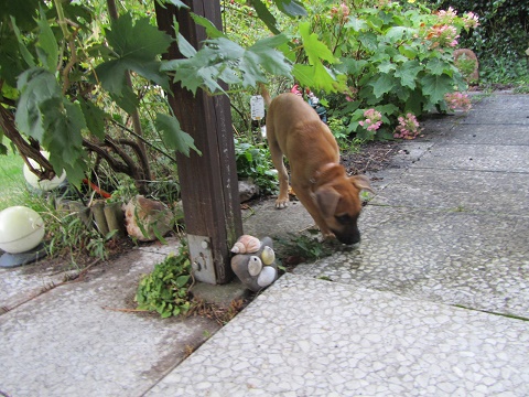 Meine 8-jährige Labrador-Hündin Borka ist aufgrund ihrer schlechten Hundeerfahrungen und Ambras Lebendigkeit noch sehr verunsichert, grenzt sich aber vorsichtig ab; meistens sucht sie sich im Garten und Haus einen anderen Platz. Von daher ist es noch schwierig ein gemeinsames Foto zu schießen.