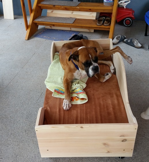 Außerdem hat mein Frauchen mir auch ein richtiges gemütliches Bett mit meinem Namen gebaut.
