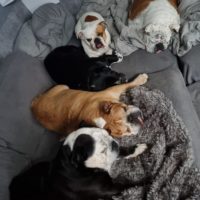 Außerdem finde ich meine Familie echt super. Die haben noch so ein Waldhaus. Das macht mir dolle Spaß da durch den Wald zu schlendern und mit der dicken Elfriede alles abzuschnüffeln. Meine Bullyschwestern küssen mich ständig, find ich auch ganz gut. Mein Bullybruder guckt immer ganz streng, aber auch der läßt sich zu einem sehr männlichen, aber ganz heimlichen Flüchtigkeitsschmatzer hinreißen. Dann dauert es wohl nicht mehr lange bis er endlich auf meine Spielaufforderungen eingeht. Juchuu.