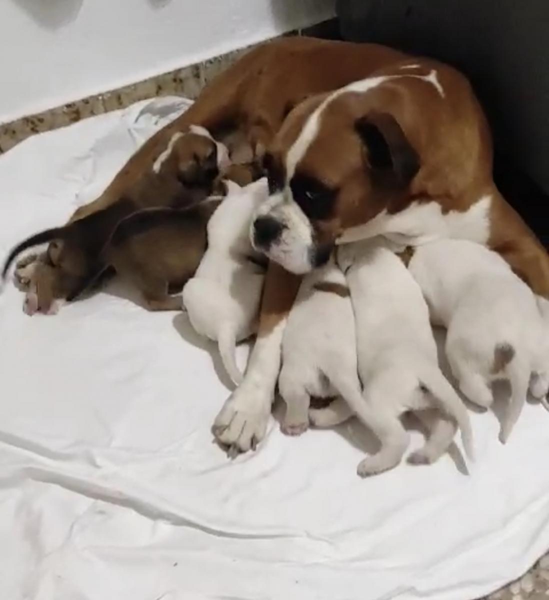 Unsere Boxer-Mama hat alle Pfoten voll zu tun uns satt zu bekommen, aber uns geht es gut und wir tollen lustig durchs Leben. 3 Mädels (Heaven, Happy Lou & Halali) und 3 Jungs (Habana, Harlekin & Hemingway) sind wir.