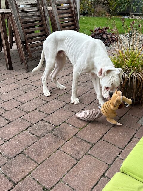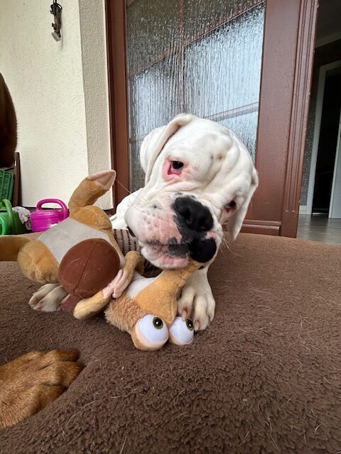 Ich bin 8 Monate jung, groß, schlaksig und bringe jede Menge Lebensfreude mit. Zwar bin ich taub, aber dafür lerne ich besonders aufmerksam und beobachte alles ganz genau. Mit meinen Boxerkumpels Lotte und Piet habe ich schon viel gelernt: Ich bin stubenrein, gehe gern auf mehrere kleine Spaziergänge um meine Muskeln aufzubauen und genieße meine Ruhephasen danach ausgiebig.