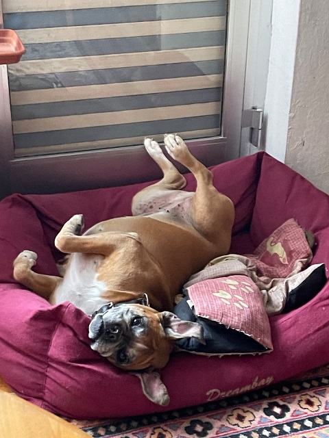 Leider mußten wir unsere Kinta nach fast 5 Jahren bei uns, nach einem für uns alle – und besonders auch sie – traumhaften Wochenende in Rodenkirchen bei unseren Kindern am 26.9. 23 über die Regenbogenbrücke gehen lassen.