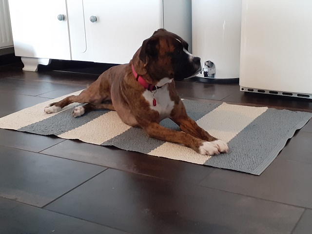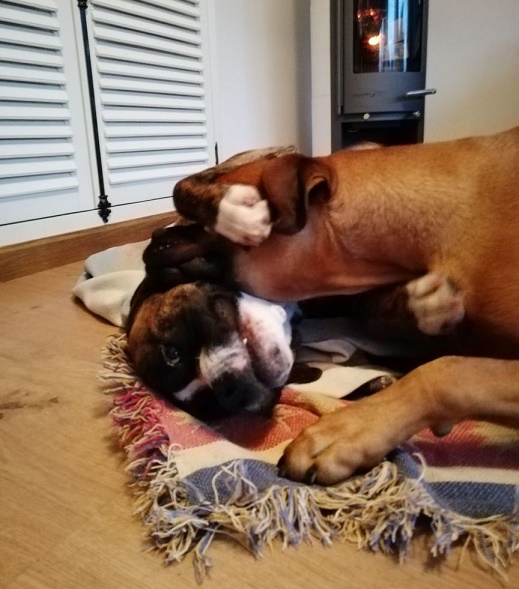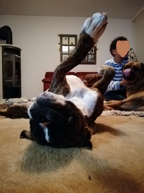 Außerdem gibt es hier noch zwei Menschenkinder. Ich liebe sie. Kinder begeistern mich. Sie sind toll, mit ihnen kann man Bestens spielen und kuscheln, es ist wunderbar sie um mich zu haben, denn ihnen vertraue ich. Erwachsenen, vor allem Männern traue ich noch nicht so recht über den Weg. Vorsichtshalber belle ich sie dann erst einmal an, aber unsere Familien Mama liebt mich so wie ich bin. Sie sagt, ich bin ein entzückendes, kleines Boxermädchen, ich brauche nur noch etwas Zeit um Vertrauen zu fassen. Außerdem lerne ich schnell und höre auch schon gut auf meinen Namen. Meine Familie ist sehr glücklich das ich hier bin und ich fühle mich auch sehr wohl.
