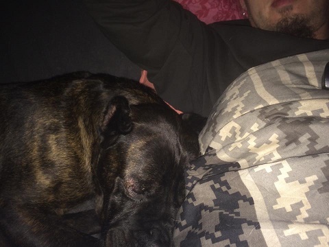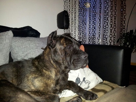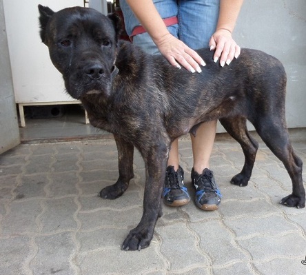 Lada ist eine ca. 7 Jahre alte, gestromte Cane Corso Hündin mit kupierten Ohren.