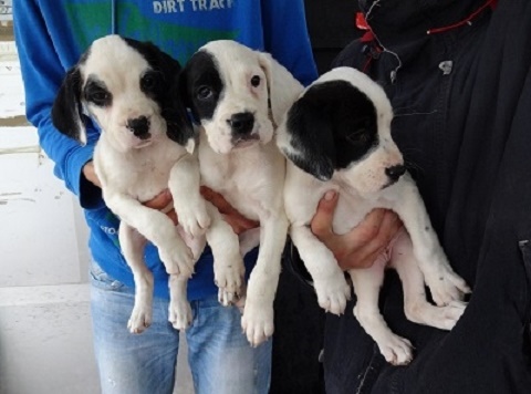 Die Mama ist eine weiße Boxerhündin, der Papa ein Pointer.