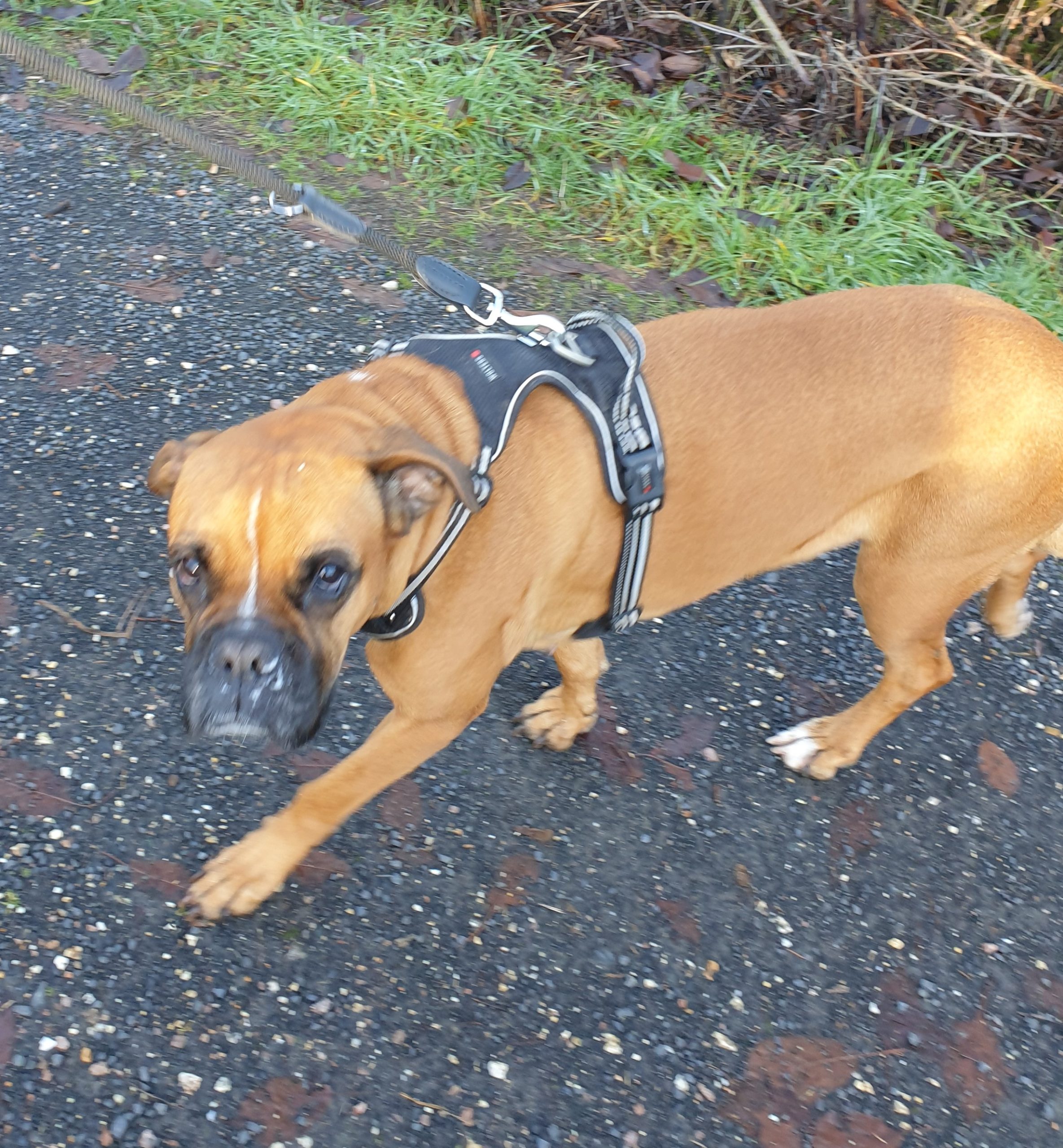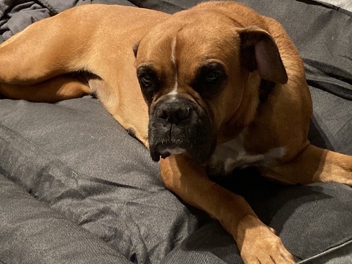 Ich bin nach der langen Reise aus Spanien endlich in ein tolles Zuhause gekommen, wo sich viel mit mir beschäftigt wird, ich regelmäßig Futter bekomme und ich Jemandem meine ganze Liebe schenken kann. Ich bin total begeistert von dem Garten, den ich für mich alleine habe. Aber diese komischen Bälle und Quietschtiere die da rum liegen finde ich uninteressant, damit weiß ich nichts anzufangen. Ich brauche halt kein Spielzeug; nur ausgedehnte Kuscheleinheiten und boxertypisches Raufen. Leider muss ich mich damit noch zurückhalten, weil mir immer die Nase läuft und die Tierärztin (die ich echt nett finde und mag) sagt, dass ich erstmal „ankommen“ und langsam machen soll. Aber meine neue Familie hat mir schon versprochen, dass wir bald ganz tolle Ausflüge machen werden.