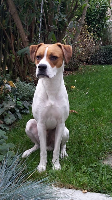 Wesen: gut erzogener junger Boxer-Mix, sucht sportliche Menschen, mit Hündinnen verträglich, Kinder sollten standfest sein