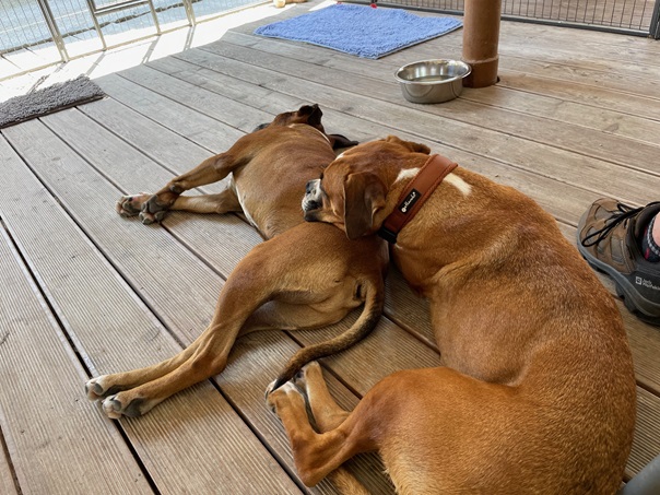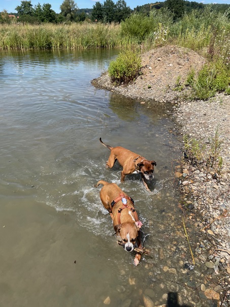 Ich bin hier sehr schnell angekommen und hab mich sofort in den sehr netten Boxer Buben Giogio verliebt… und was soll ich sagen, er mag mich auch. Er passt auf mich auf und zeigt mir alles. Das er auch so gut schwimmen kann wie ich muss ich ihm aber noch zeigen!