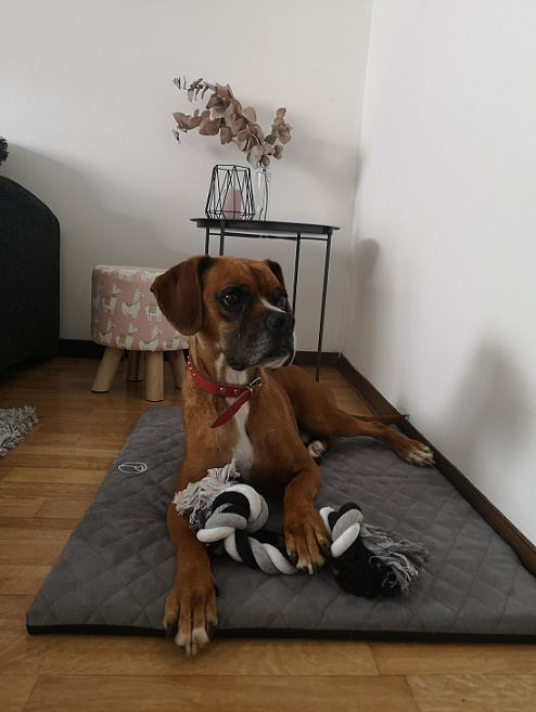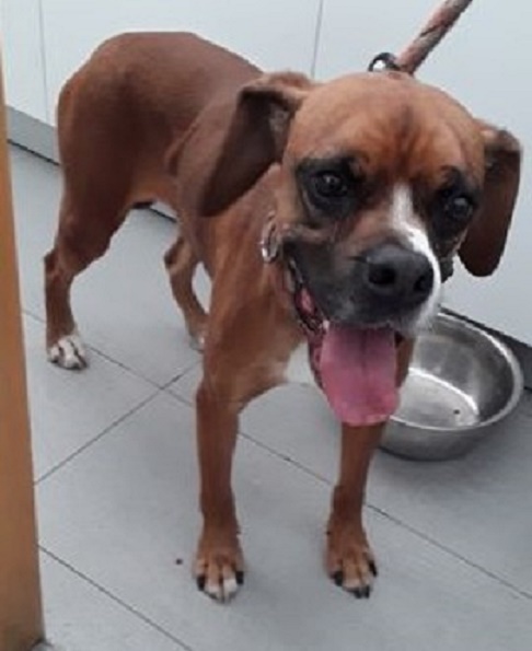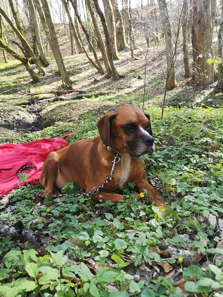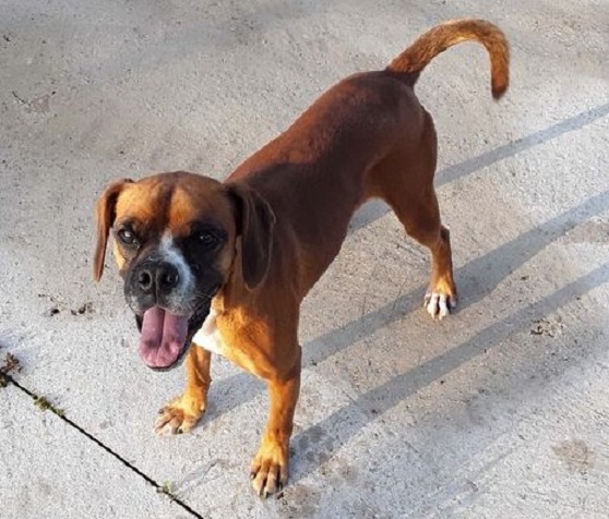 Wesen: netter Boxermix, sehr verspielt, sehr neugierig, läuft an der Leine und kann eine angessene Zeit alleine bleiben